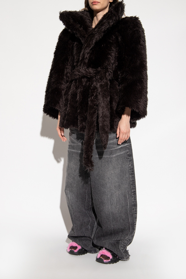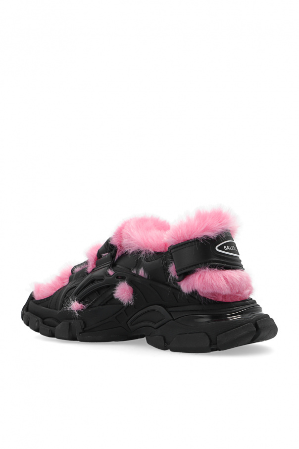 Black ‘Track’ sandals from Balenciaga. Sitting on a black rubber sole, this model features velcro closures, rubber trims, an embossed logo and a pink faux-shearling lining.