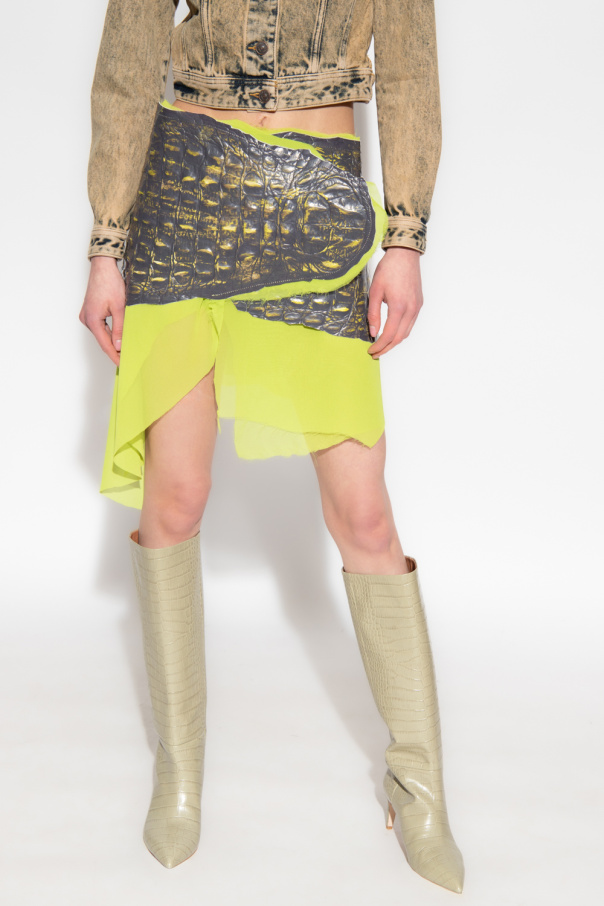 Dark grey and green ‘L-CHIDIMA’ mini skirt from Diesel. Crafted from bovine leather with a crocodile skin effect, this style features a velcro closure and asymmetrical silk chiffon trimming with a raw edge.