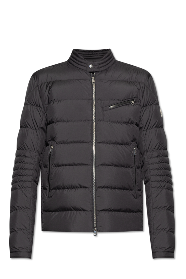 Black ‘Authie’ down jacket from Moncler. Embellished with a signature logo patch, this style fastens with a two-way zipper and snaps and features three zip pockets and long sleeves with snap-fastened cuffs.