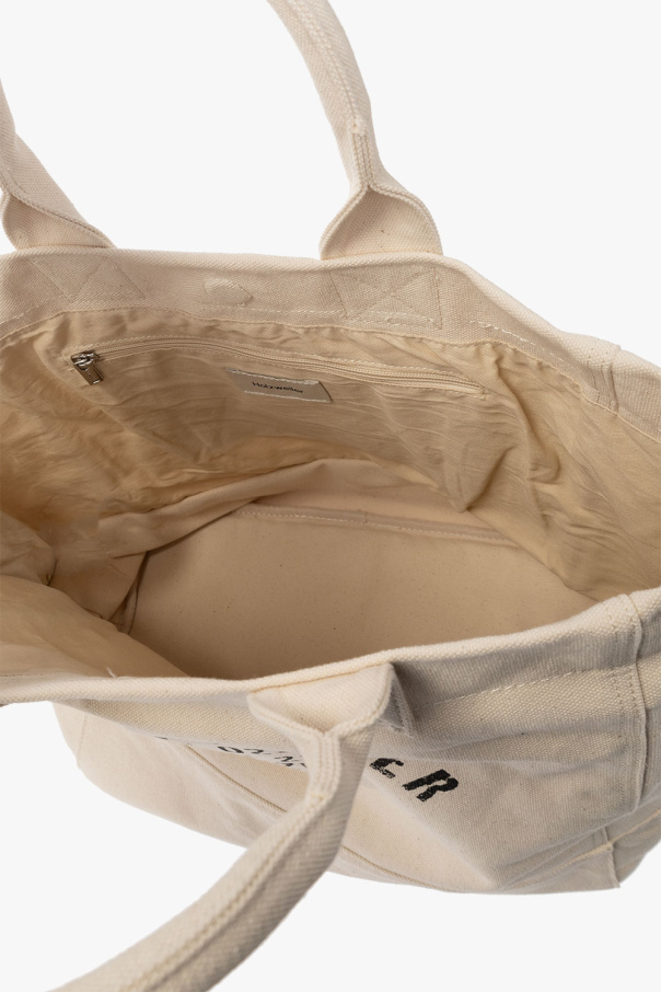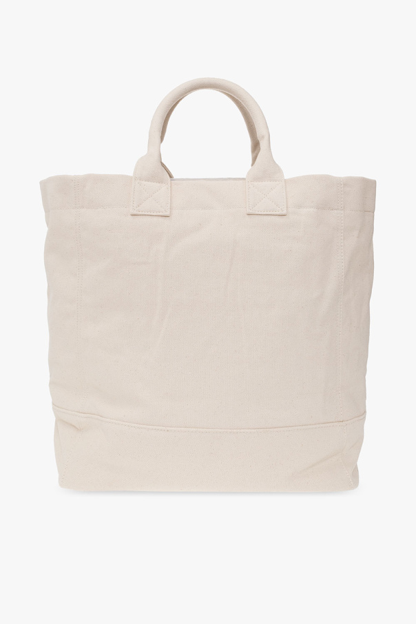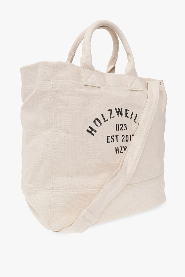 Beige 'Nordkapp' shopper bag from Holzweiler. Crafted from cotton canvas, this design secures with a magnetic fastener and features a printed black logo, two half-round handles, a detachable and adjustable shoulder strap, silver-tone metal hardware and one internal compartment with a zip pocket.