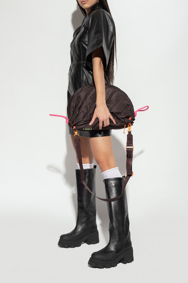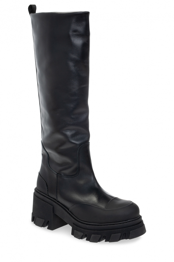 Black heeled boots from Ganni. Made of calf leather, this almond toe pair features a logo detail at the back and black rubber sole.