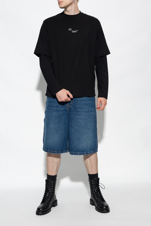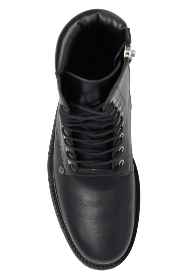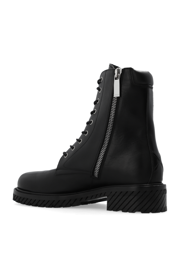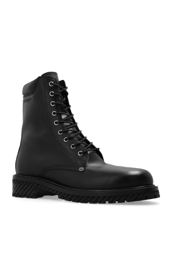 Black lace-up combat boots from Off-White. Made of leather, this pair is decorated with an embossed logo on the side and set on a black rubber sole.