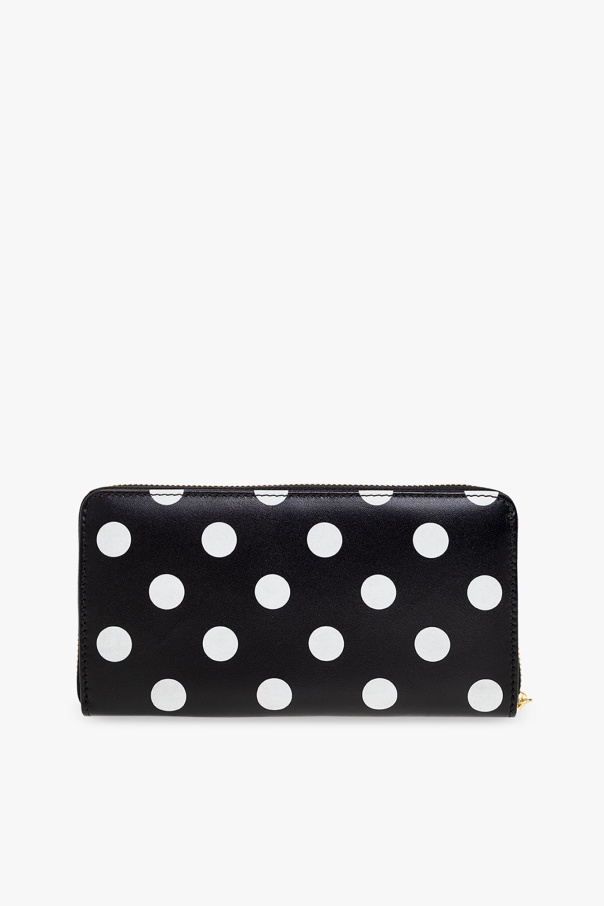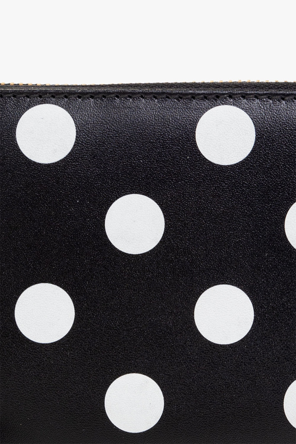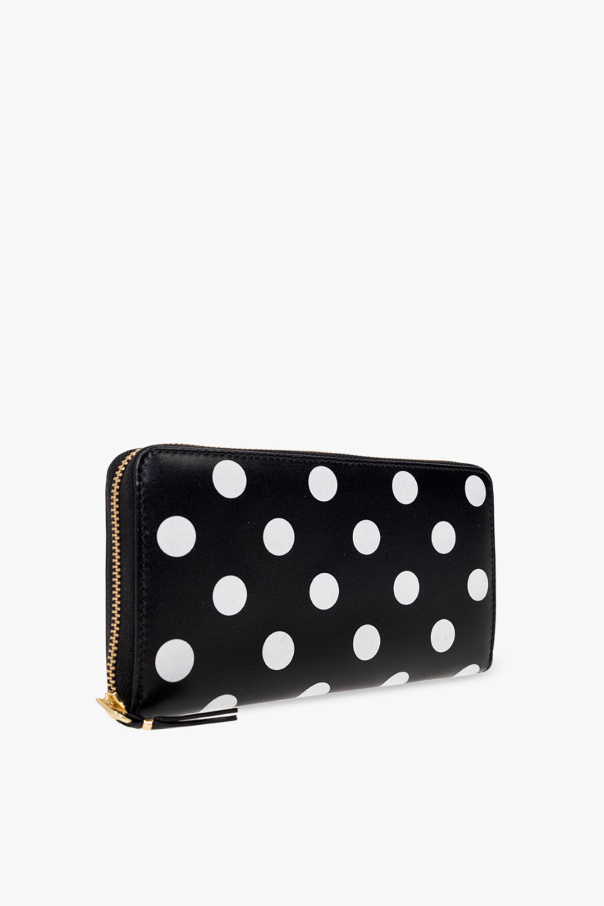 Black wallet from Comme des Garcons. Made of patent leather and decorated with a dotted pattern, this item fastens with a zipper and features gold-tone metal hardware and two compartments, twelve card slots, two bill gussets and one zip pocket inside.