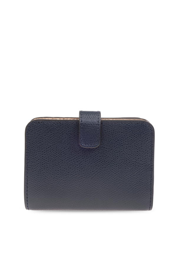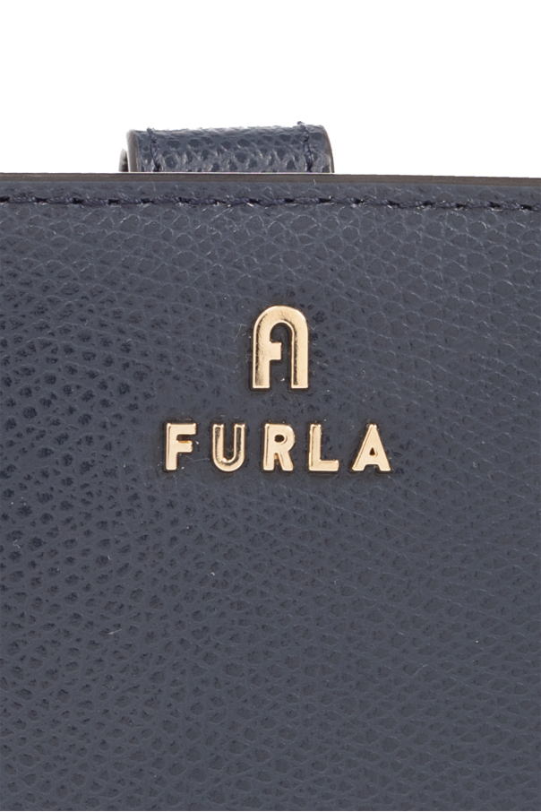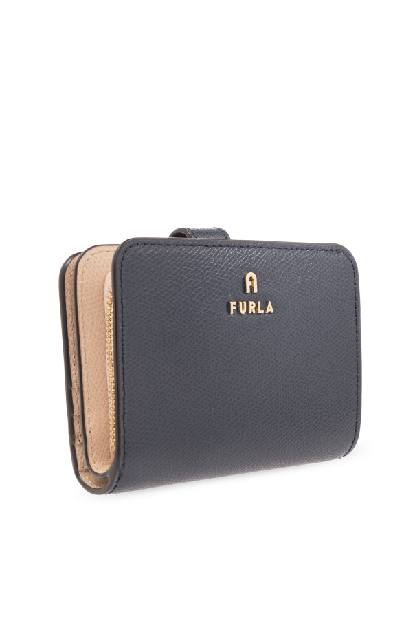 Navy and beige ‘Camelia Small’ bi-fold wallet from Furla. Made of grained leather, this item features a snap closure, logo detail, zipped coin pocket and gold-tone metal hardware as well as one bill compartment and ten card slots inside.