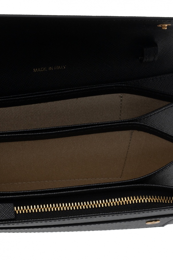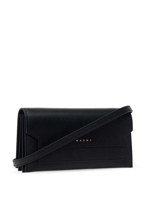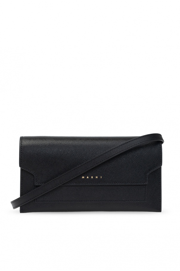 Black wallet from Marni. Crafted from saffiano calf leather, this item fastens with snaps and is complete with a detachable and adjustable shoulder strap, embossed logo and metal hardware in gold-tone. It has one slip pocket, two bill compartments and one zipped coin pocket inside.
