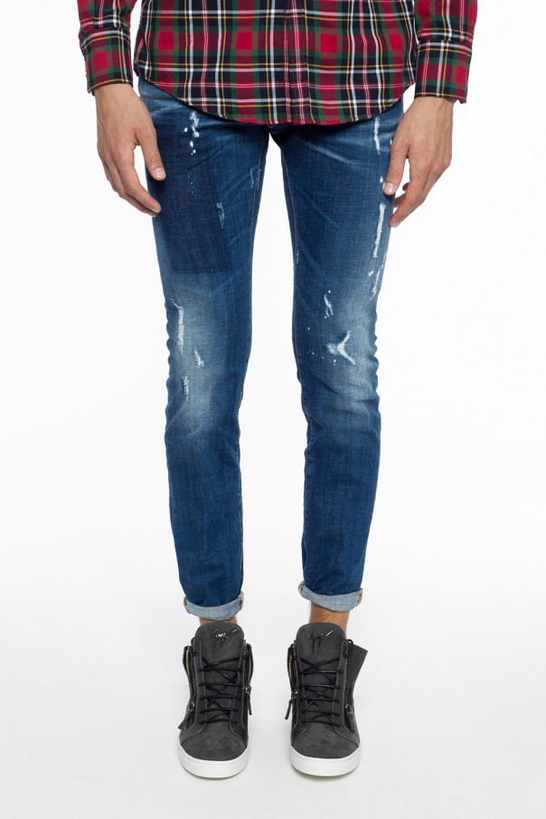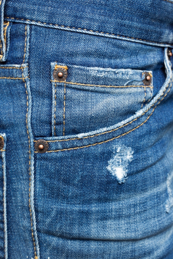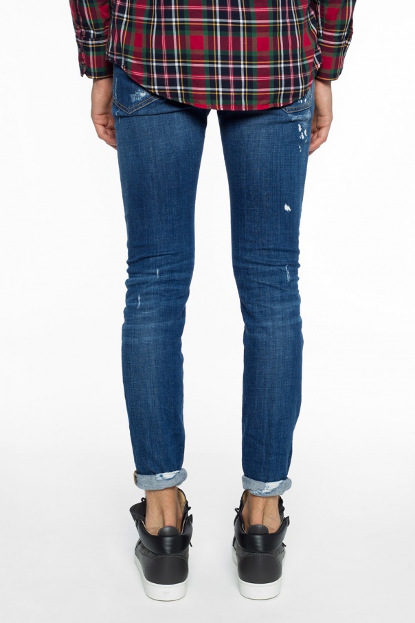 Blue 'Jennifer Jean' distressed jeans from Dsquared2. Button fastening. White signature paint splatter effects. Tapered, cropped legs.