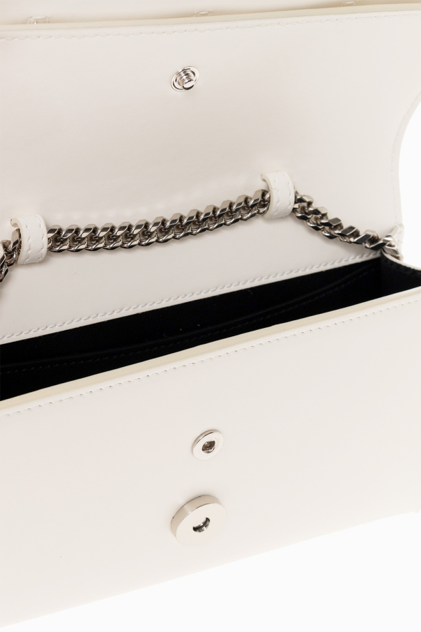 Cream ‘The Slash’ quilted clutch from Alexander McQueen. Crafted from leather, this model fastens with a snap and is enriched by a cut-out flap and decorative ring handle embellished with Swarovski crystals. It is complete with a detachable shoulder chain with toggle closure, silver-tone metal hardware and one internal compartment with one slip pocket and one card slot.