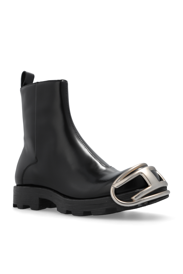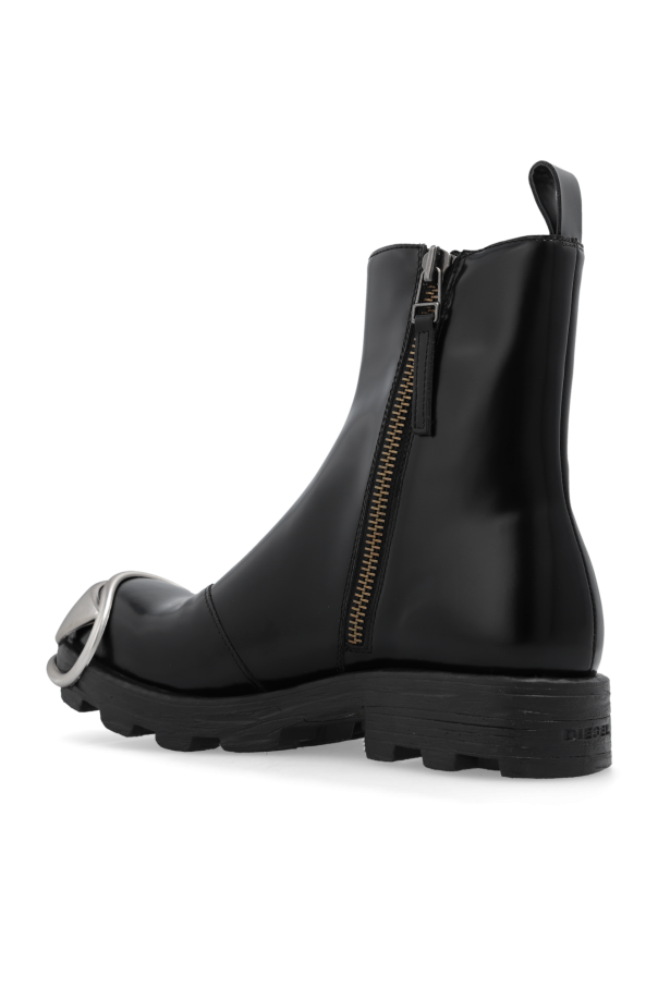 Black ‘D-HAMMER’ shoes from Diesel. Made of smooth leather, this model sits on a black rubber sole and features a side zip and a silver-tone metal logo emblem on the front.