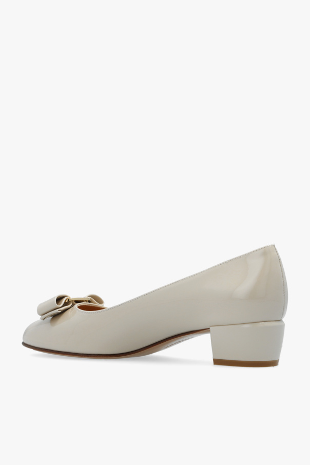Light beige ‘Vara’ pumps from FERRAGAMO. Made of patent calf leather, this pair features a bow with a logo-engraved detail in gold-tone and a beige leather sole.