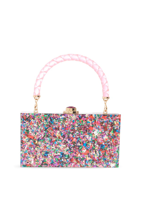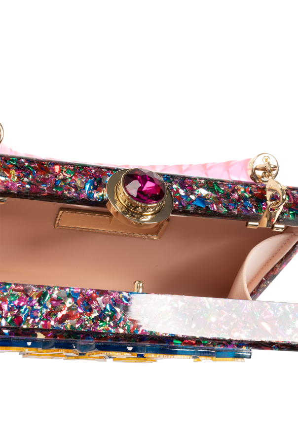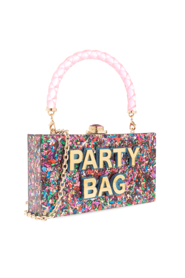 Multicoloured ‘Cleo’ clutch from Sophia Webster. Crafted from a confetti acrylic outer, this design fastens via a snap and showcases a 3D ‘Party Bag’ text on the front, a detachable chain shoulder strap, one half-round handle, gold-tone metal hardware and one internal compartment.