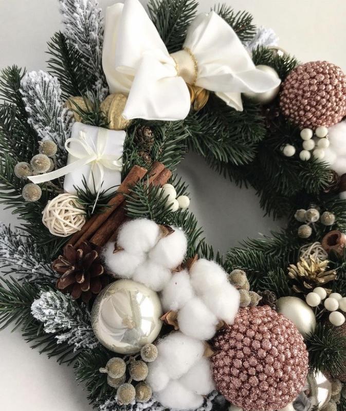А як красиво виблискує на світлі .Різдвяний віночок з бавовною.