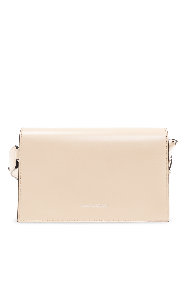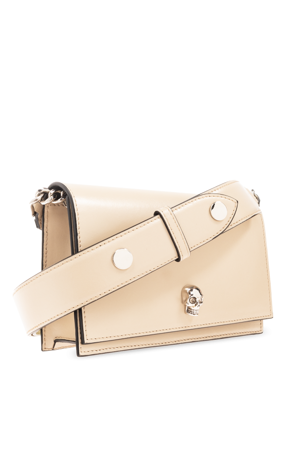 Beige ‘Skull Small’ shoulder bag from Alexander McQueen. Made of calf leather, this design features a snap closure with the brand’s signature closure embellished with Swarovski crystals, adjustable shoulder strap, silver-tone metal hardware and one internal compartment with one card slot.