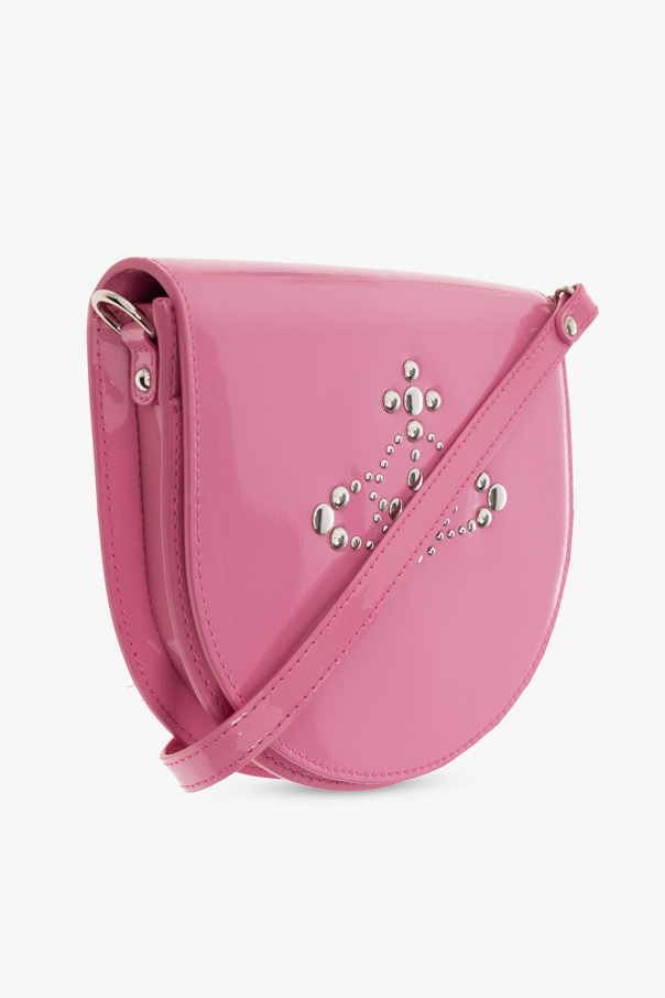 Pink ‘Saddle’ shoulder bag from Vivienne Westwood. Crafted from patent calf leather, this model is complete with a magnetic closure, metal logo appliqué with round studs, belt loops at the back – can be worn as a belt bag, detachable and adjustable shoulder strap, silver-tone metal hardware and one internal compartment with one slip pocket.