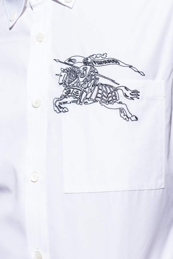 White ‘Fernley’ shirt from Burberry. Crafted from cotton, this design features button fastenings, a black Equestrian Knight logo embroidery, collar, slip pocket and long sleeves with buttoned cuffs.