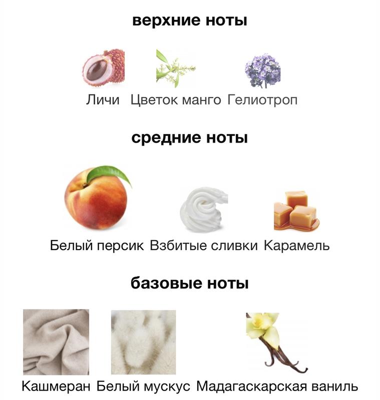 Верхние ноты прельщают сладким наслаждением с тропическим колоритом – здесь причудливо переплелись ноты личи с гелиотропом и цветами манго. Им вторит мелодия «сердца», где сочные тона белого персика аранжированы со взбитыми сливками и карамелью – божественный гурманский десерт! Напоследок окутайте себя мягким шармом кашмерана, чьё древесное обаяние усилено нежностью драгоценной мадагаскарской ванили и магической притягательностью белого мускуса – одновременно сексуального и невинного.
