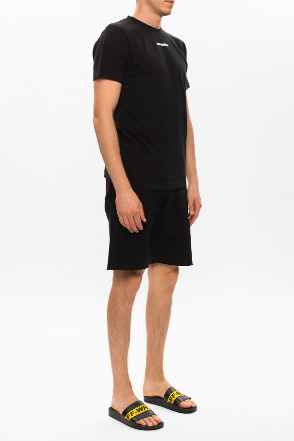Black slides from Off-White. Seated on a black rubber sole, this model is enriched by a yellow, red and black patch with the brand's logo.