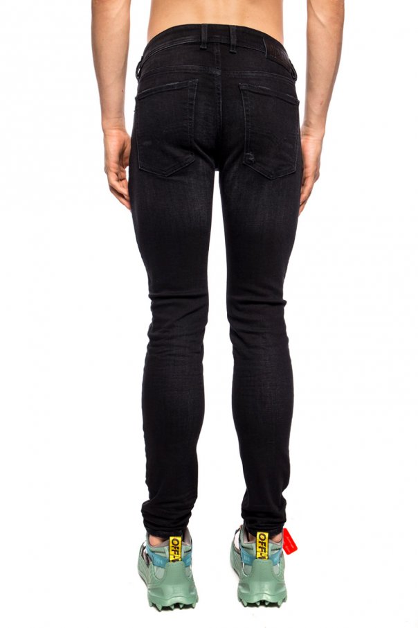 Black 'Sleenker-X' distressed jeans from Diesel. Fastened with buttons. Decorated with a logo-embossed patch. Two slip pockets on the front, two at the back. Raw trim. Tapered legs.