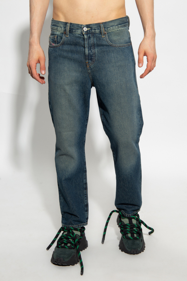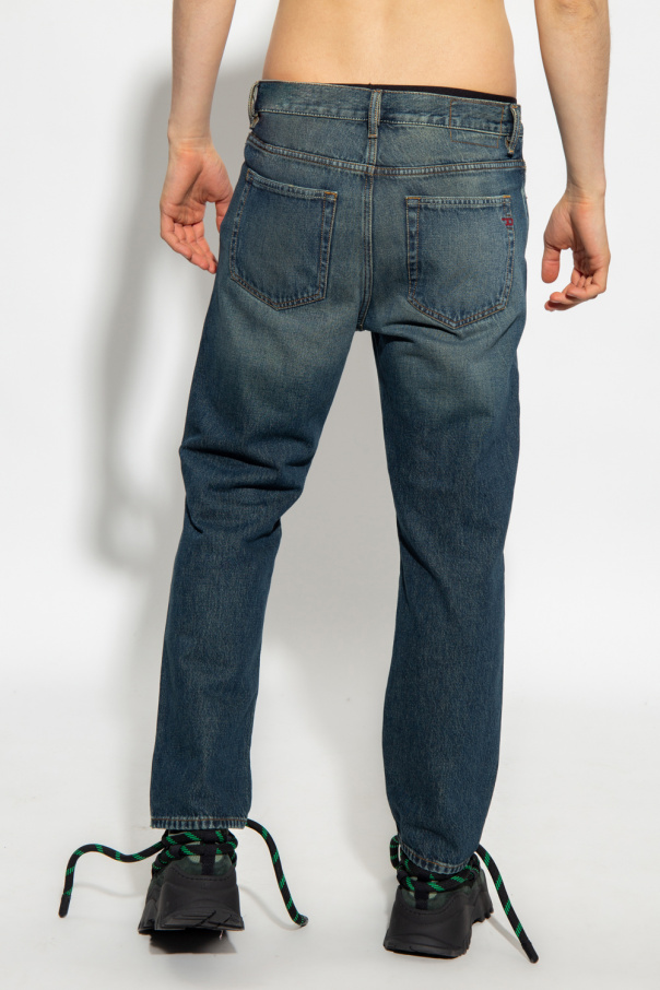 Navy blue and yellow ‘2020 D-Viker’ jeans from Diesel. Made of cotton from sustainable farms, this pair features a loose-fitting silhouette, button fastenings, straight legs, classic five pockets and red logo embroidery on the back.
