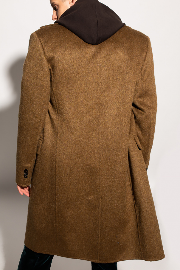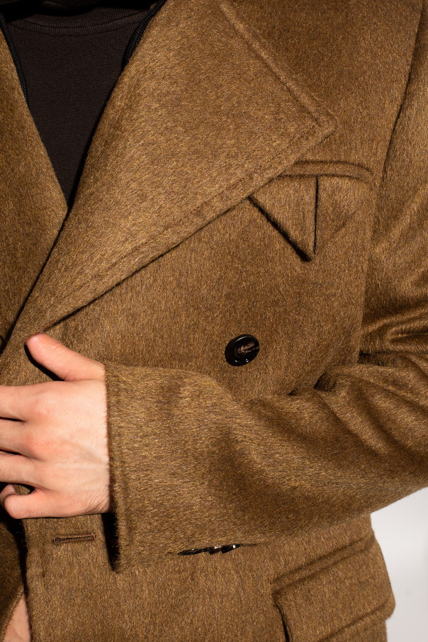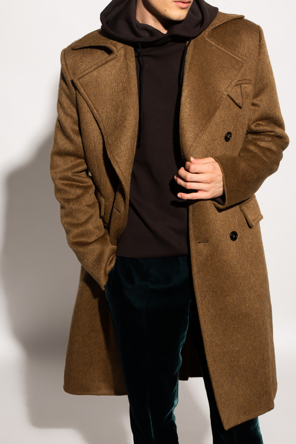 Brown double-breasted coat from Bottega Veneta. Crafted from a wool blend, this style features button fastenings, notch lapels, three pockets pockets on the front (including two with flaps), long sleeves and a single vent on the back.