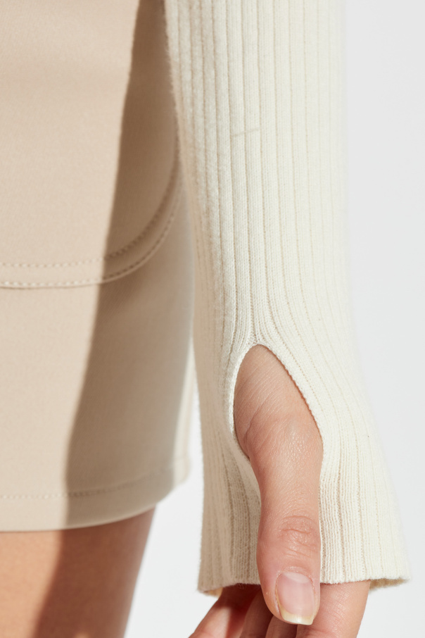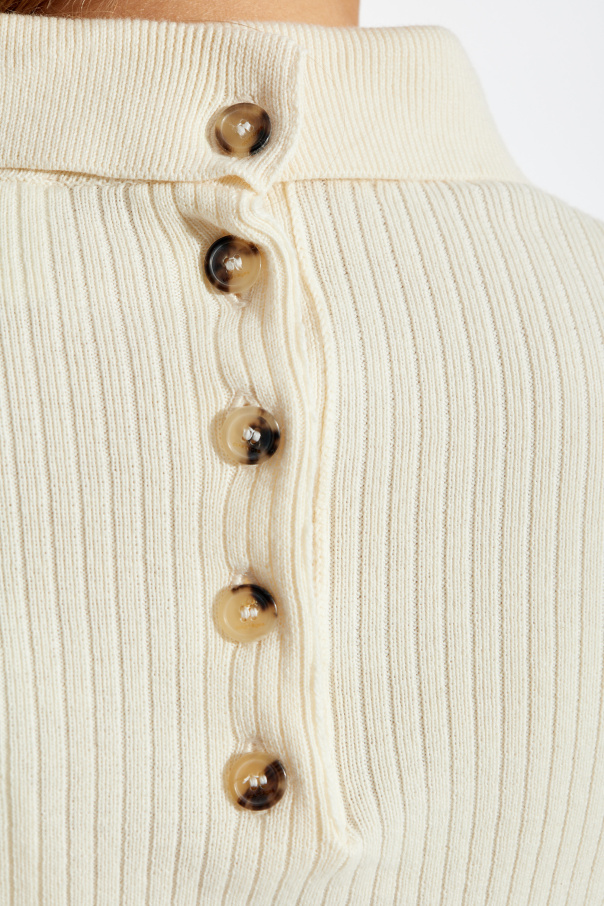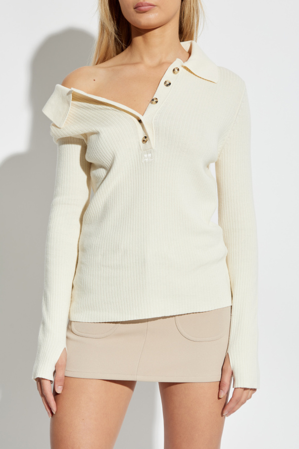Introducing the Cream Ribbed Sweater by Courrèges, an epitome of elegance and contemporary design. This cardigan-style sweater, crafted from a luxurious blend of cotton and wool, exudes sophistication with its ribbed texture and exquisite detailing. The long sleeves and classic, tailored fit create a timeless silhouette, while the button-down front allows for versatile styling and a personalized neckline. The fabric is soft to the touch, ensuring ultimate comfort and elasticity. One of the standout features is the asymmetrical neckline that partially reveals one shoulder, giving the piece a modern twist. The dark, decorative buttons provide a striking contrast to the creamy hue, enhancing its refined aesthetic. Additionally, the sleeves are innovatively designed with thumb holes, offering a practical and stylish touch. The absence of visible branding maintains a subtle, understated elegance, making it a versatile addition to any wardrobe, perfect for both formal and casual occasions. Why Choose This Product? Elegant and contemporary design by Courrèges Luxurious blend of cotton and wool for comfort and flexibility Asymmetrical neckline adds a modern flair Decorative buttons in contrasting color Thumb holes for practical and stylish wear Versatile cream color that complements various outfits