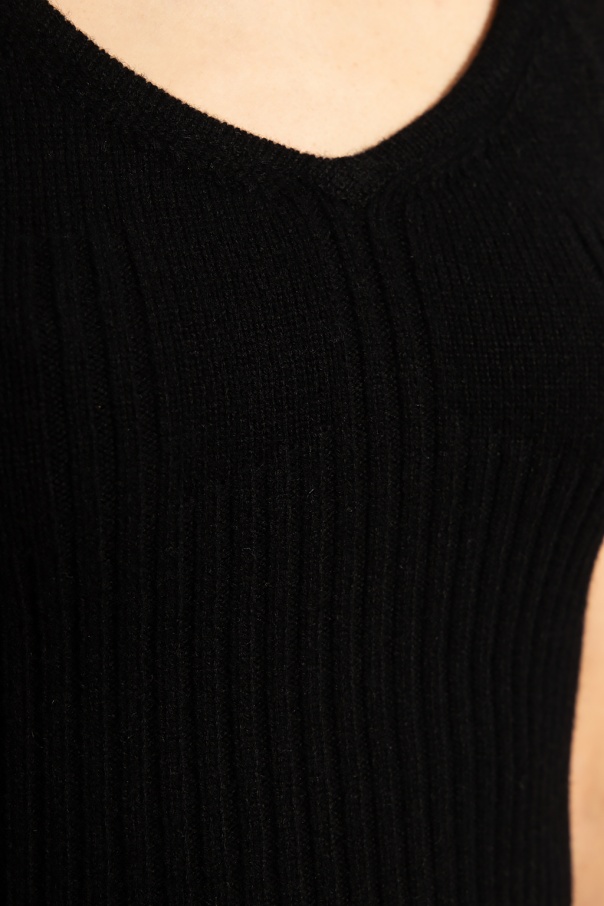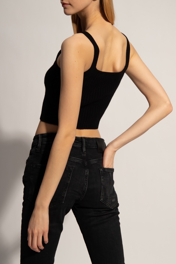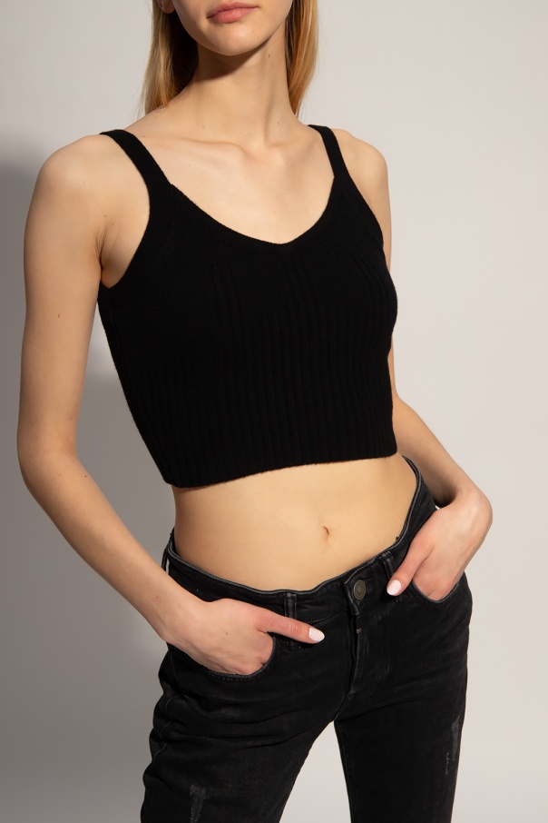Black ‘Ivana’ cropped top from AllSaints. Crafted from cashmere, this sleeveless garment features ribbed detailing.