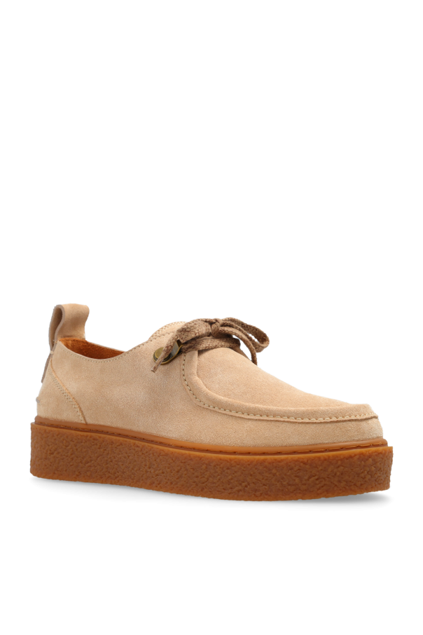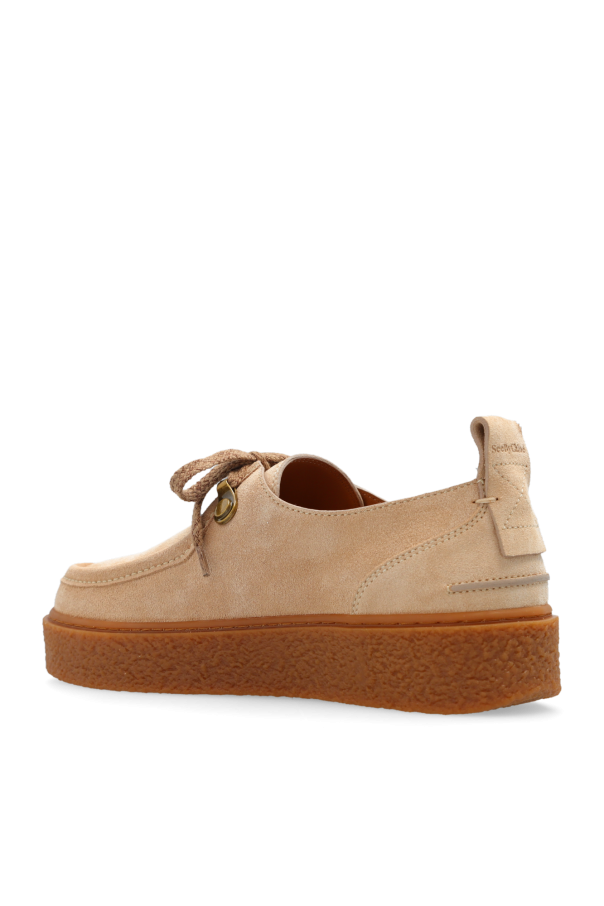 Beige ‘Jillie’ platform boots from See By Chloe. Made from suede, this lace-up model sits on a brown rubber sole and features a logo-embossed pull tab at the back.