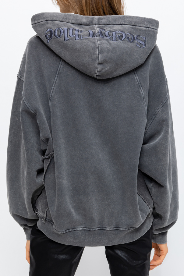 Grey sweatshirt with a drawcord-adjustable hood from See By Chloe. Made from cotton with a relaxed fit, this style features an embroidered logo on the hood, decorative, raw-trimmed panels with two slip pockets on the sides, one slip pocket, dropped shoulders and ribbed trims on the edges.