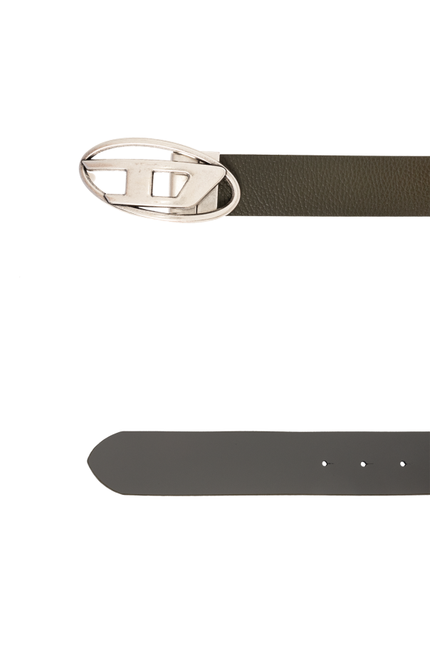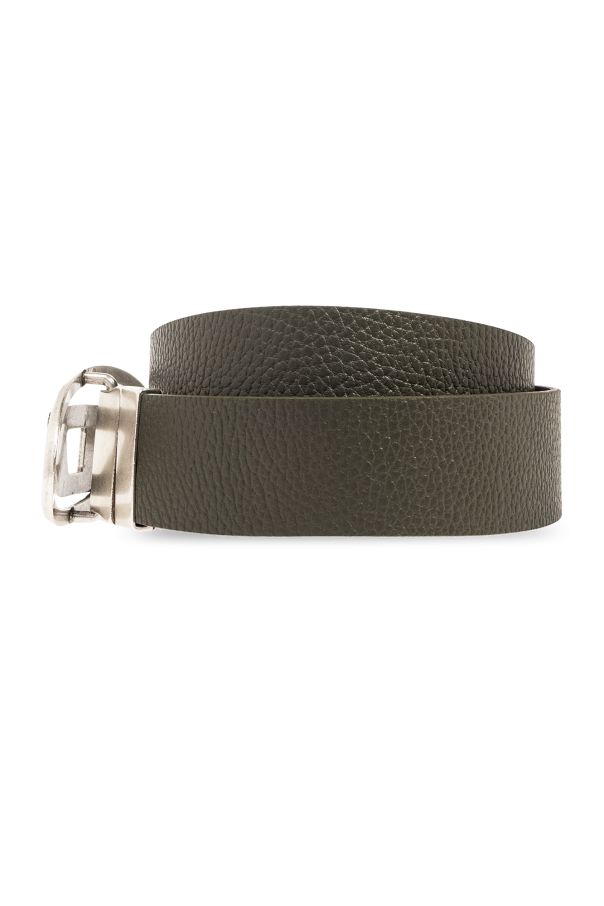 Reversible belt in dark green and grey from Diesel. Made of leather, this item features an antiqued silver-tone metal buckle in the shape of a logo.