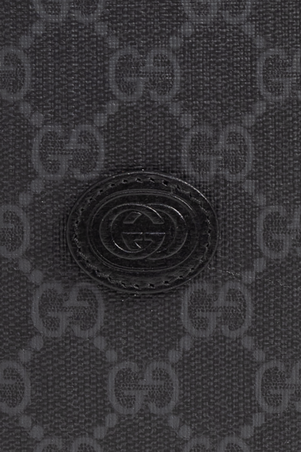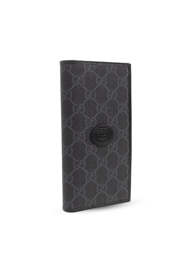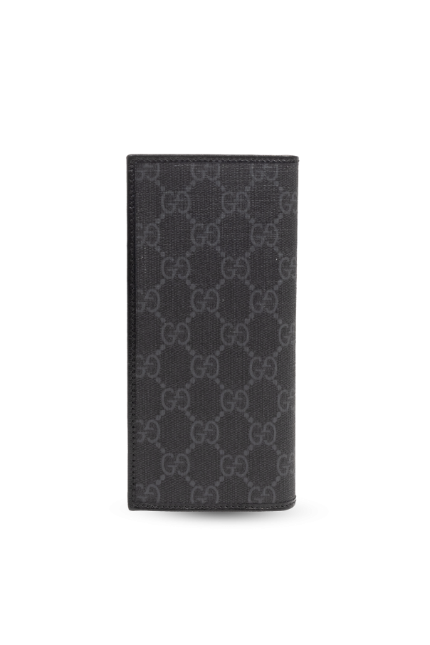 Black and grey folding wallet from Gucci. Crafted from ‘GG Supreme’ canvas and trimmed with leather, this design showcases a logo patch as well as three slip pockets and twelve card slots inside.