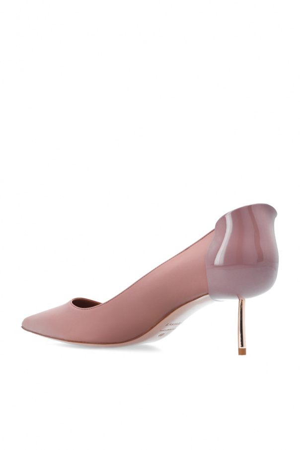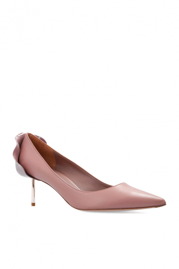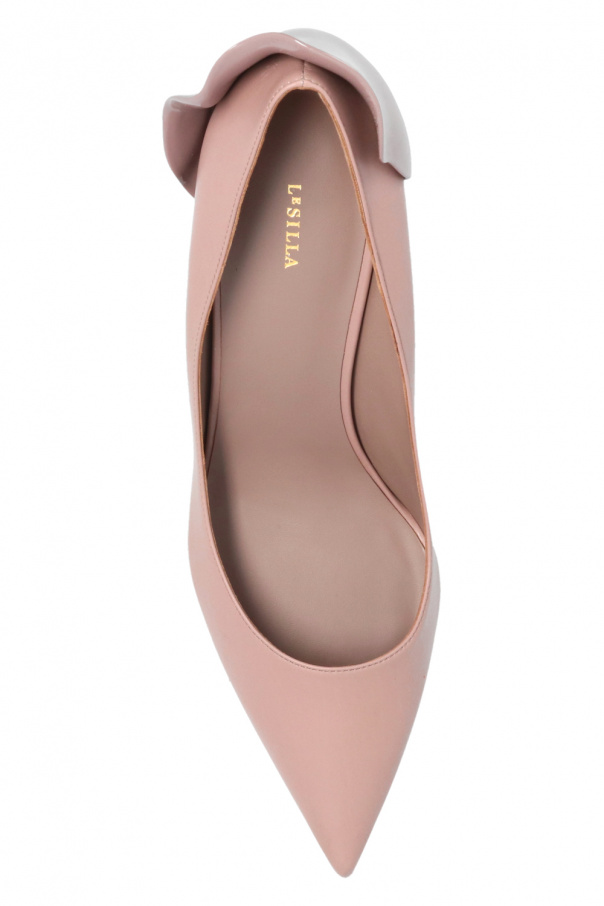Blush pink ‘Petalo’ pumps from Le Silla. Crafted from leather, this model features a metal appliqué, pointed toe, gold-tone metal heel and leather sole in beige and brown. Handcrafted in Italy.
