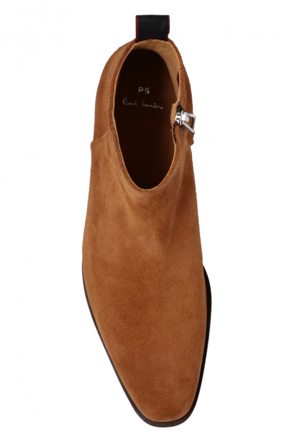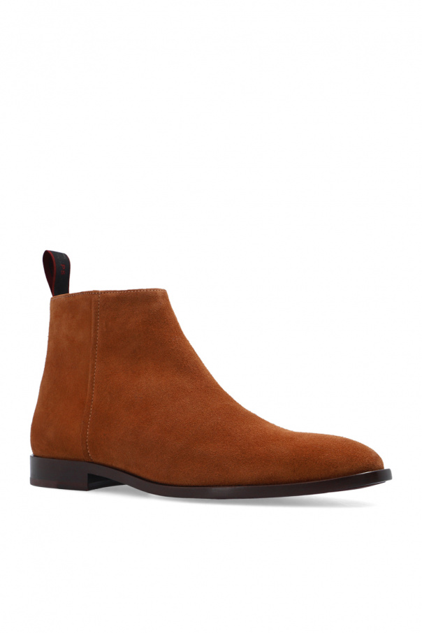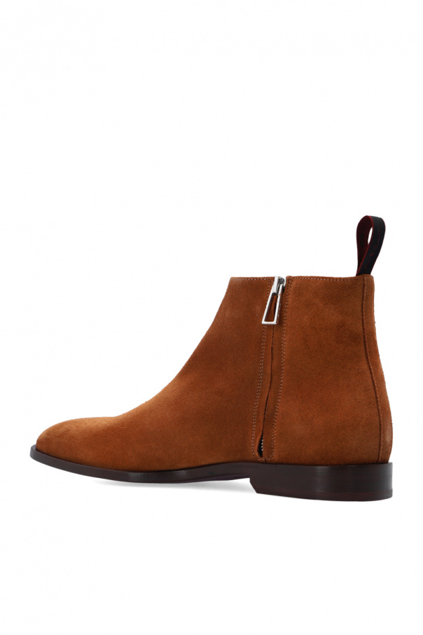 Brown ‘Alan’ ankle boots from PS Paul Smith. Made in Portugal from premium suede leather, this model features a side zip closure, an almond-shaped toe, a black and maroon heel pull tab and a maroon rubber sole.
