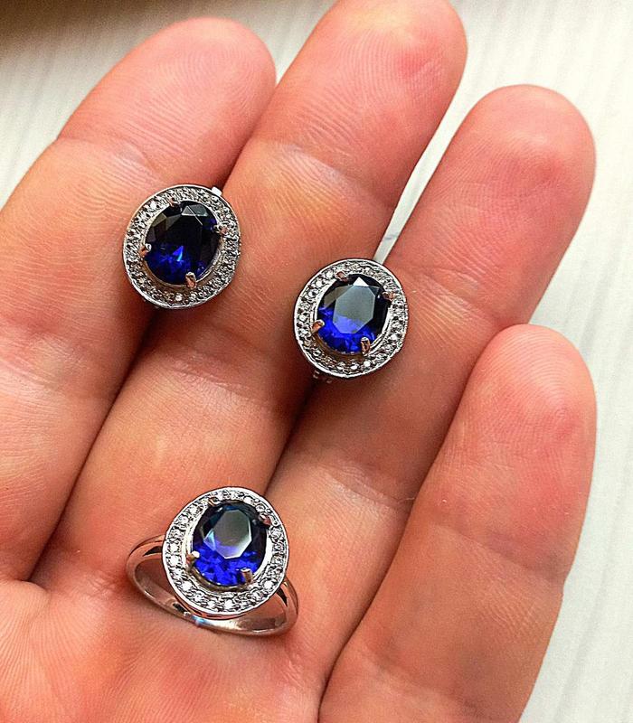 Серебряный набор украшений с сапфирами и размером кольца 18 представляет собой