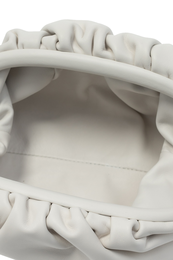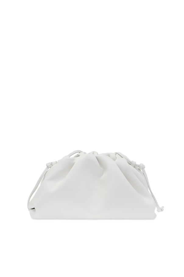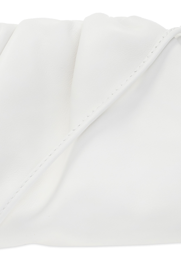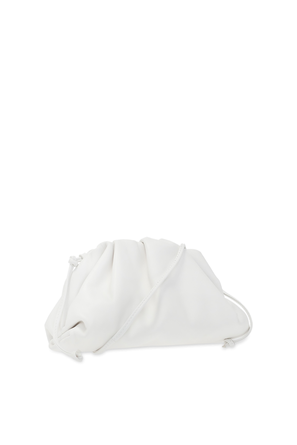 White ‘The Mini Pouch’ shoulder bag from Bottega Veneta. Crafted from calf leather accentuated with the label's iconic 'Intrecciato' weave, this design fastens via a magnetic snap-button and features a leather shoulder strap and interior with one compartment.