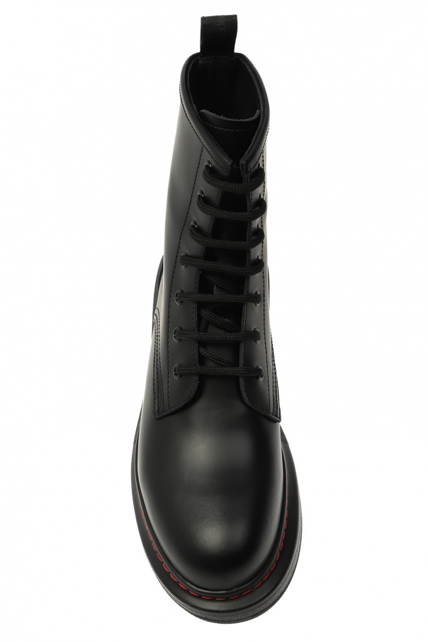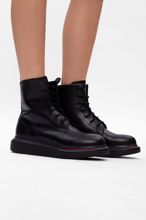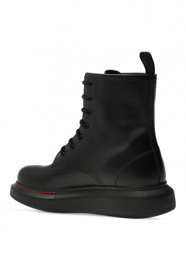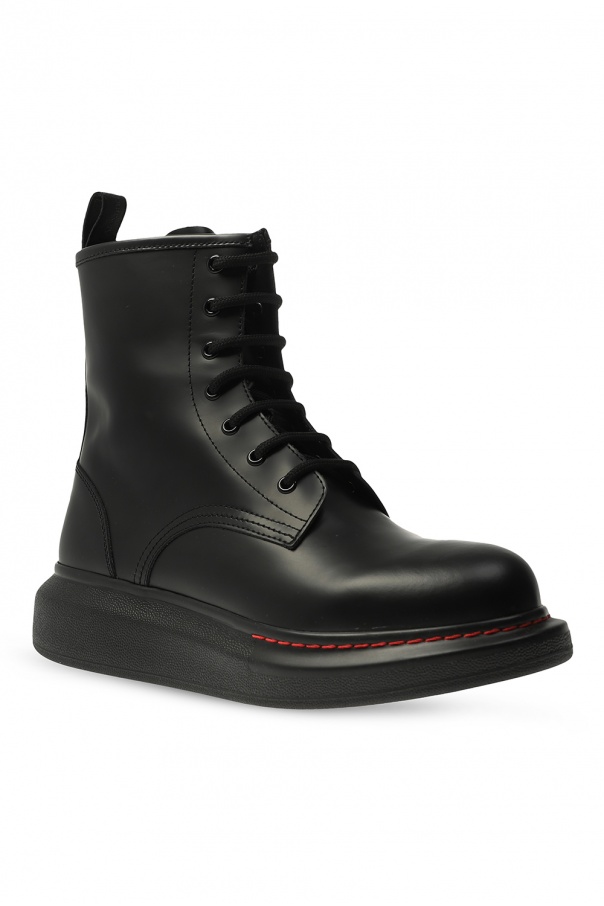 Black ankle boots from Alexander McQueen. Set on black rubber sole which takes a reference to the flagship sneaker, this lace-up design has branded webbing pull tab on the back and distinctive red seams on the front.