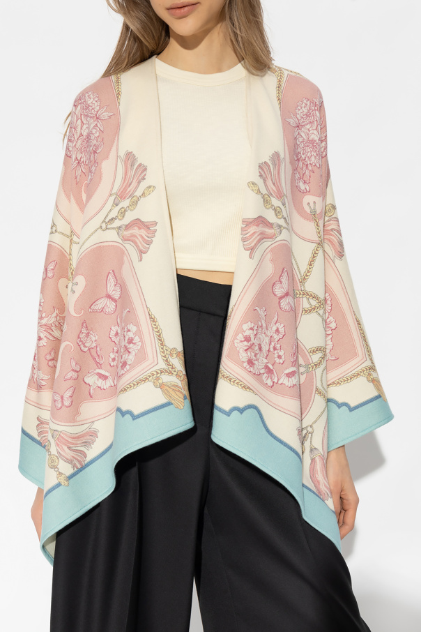 Beige poncho from Etro. Made of virgin wool, this design features a multicolored heart and floral pattern.