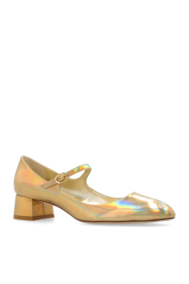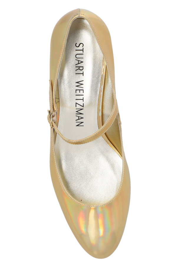 Gold-tone ‘Vivienne’ pumps from Stuart Weitzman. Made of coated leather with a holographic effect, this pair features an adjustable buckle strap, almond toe and beige leather sole.