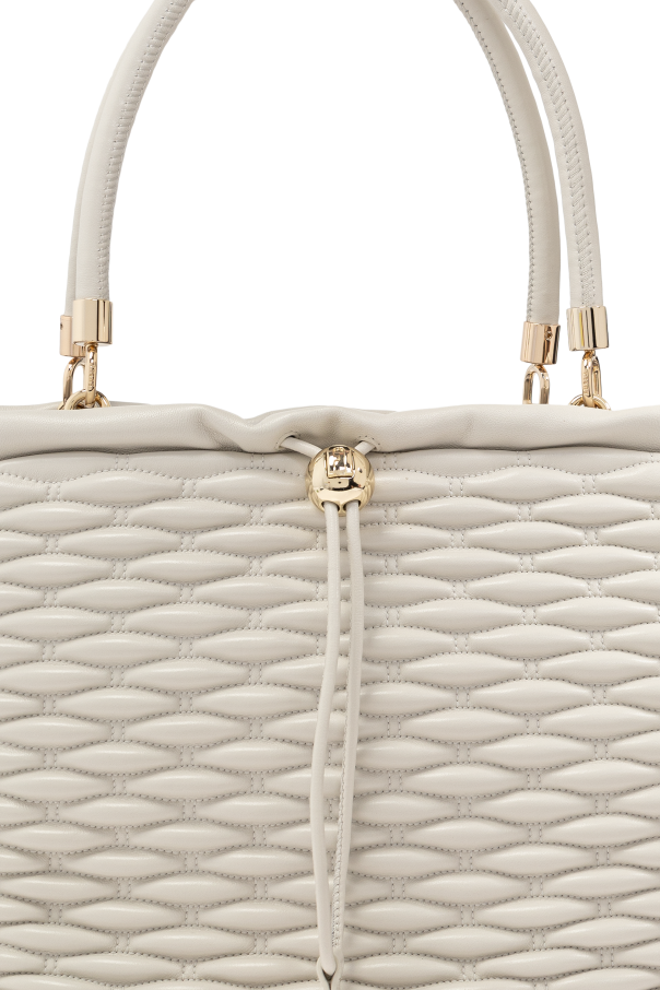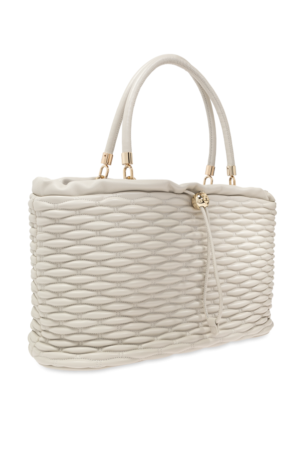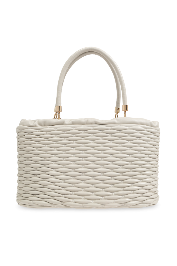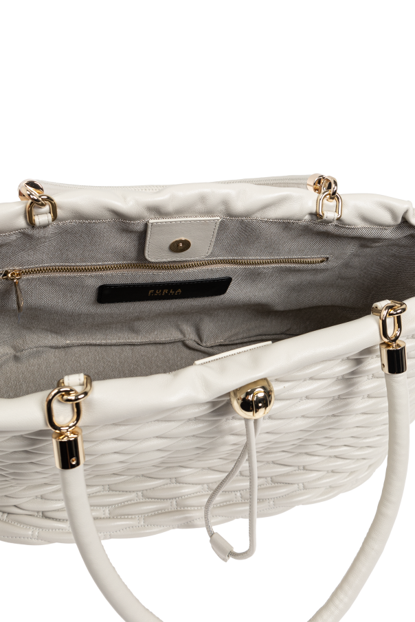 Introducing the Mionido Large shoulder bag by Furla, an epitome of sophistication and modern design. Crafted by the renowned Italian brand established in Bologna in 1927, this luxurious accessory seamlessly blends classic elegance with contemporary flair. The creamy hue of the bag exudes a timeless charm, making it a versatile addition to any wardrobe. Its rectangular shape adorned with a unique geometric woven pattern adds texture and distinctiveness, ensuring it stands out in any setting. Constructed from premium leather on the exterior and lined with durable polyester, the Mionido Large promises both durability and elegance. The interior boasts a spacious compartment and three pockets—two slip pockets and one zippered—perfect for organizing your essentials. The bag features two sturdy shoulder handles affixed with gold-toned metal accents, enhancing its luxurious appeal. An elegant gold clasp with a decorative element on the front further accentuates its sophisticated design. Inside, you'll find a branded label, a testament to Furla's commitment to quality and style. The magnetic closure ensures your belongings are secure, while the semi-circular handles offer comfort and ease of use. Why Choose This Product? Timeless and versatile creamy color Unique geometric woven pattern Premium leather exterior and durable polyester interior Spacious interior with multiple pockets Elegant gold-toned metal accents and clasp Designed by the prestigious Furla brand