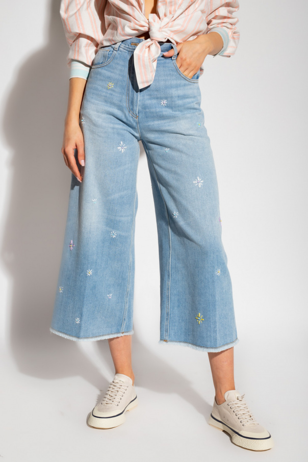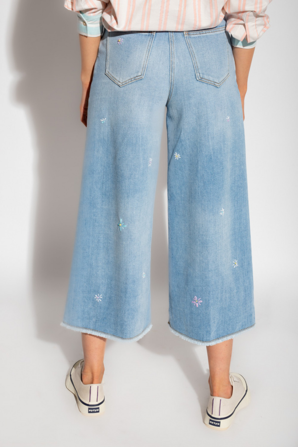 Light blue jeans from Forte Forte. Inspired by the 1970s, this pair falls with wide, cropped legs and features a high-waisted silhouette with a zip fly with a button, colourful floral embroidery, classic five pockets, raw hems and a navy blue satin logo patch at the back.