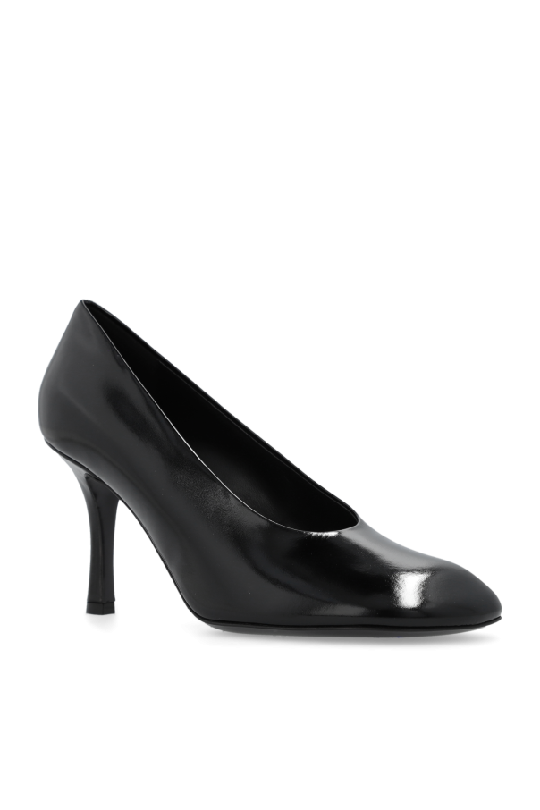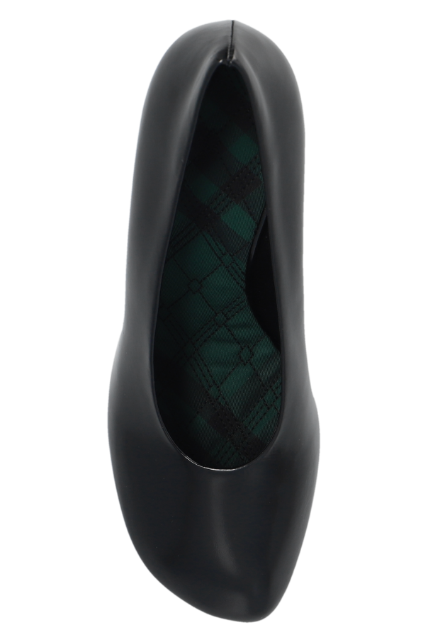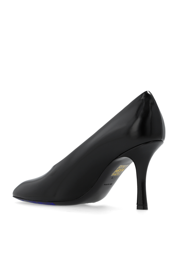 Black ‘Baby’ pumps from Burberry. Made of glossy leather, this asymmetric design features a black leather sole with a blue Equestrian Knight logo.