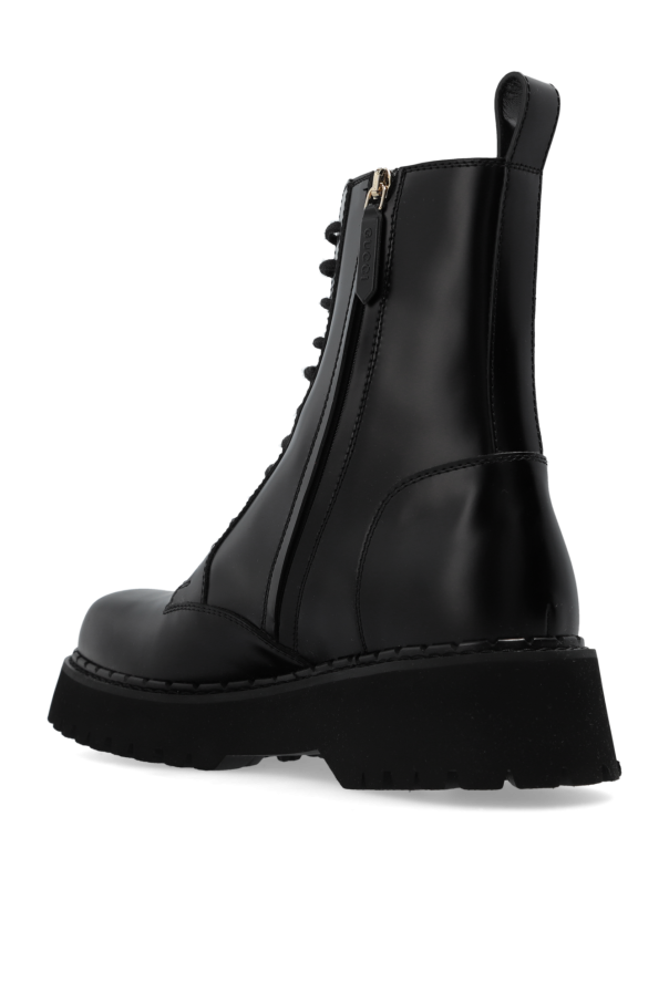 Introducing the Skórzane Buty za Kostkę by Gucci, a paragon of elegance and durability. Crafted from premium black leather, these ankle boots epitomize luxury and sophistication. The boots boast a defined silhouette with a height that extends just above the ankle, offering both style and support. The sturdy, thick sole with a pronounced tread ensures excellent traction, making them a versatile choice for various terrains. Featuring classic front lacing, these boots allow for a customized fit, while the side zipper provides ease of wear. A loop at the rear facilitates effortless donning. The interior, adorned with contrasting hues and luxurious finishes, further accentuates their uniqueness. Signature branding elements, including a logo-embellished zipper, underscore their exclusivity. Why Choose These Boots? Exquisite high-quality leather construction Classic yet contemporary design suitable for various occasions Comfortable fit with enhanced durability Exclusive details and signature Gucci craftsmanship
