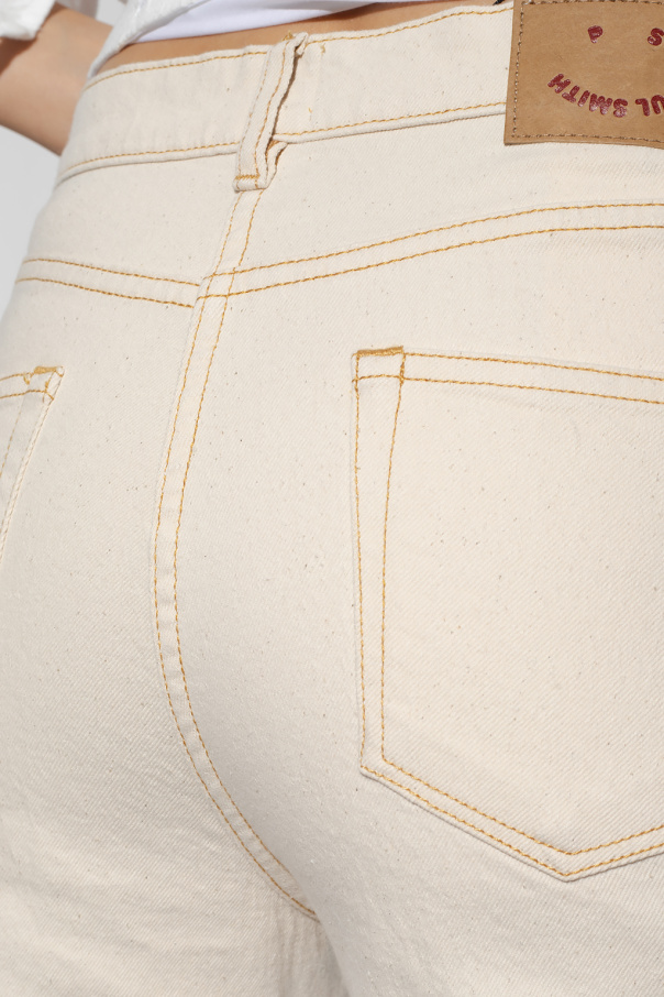 Cream high-waisted jeans from PS Paul Smith. Crafted from organic cotton, this pair features a button and zip closure, brown logo patch at the back, three front pockets, two back pockets, stitching details and kick flare legs.