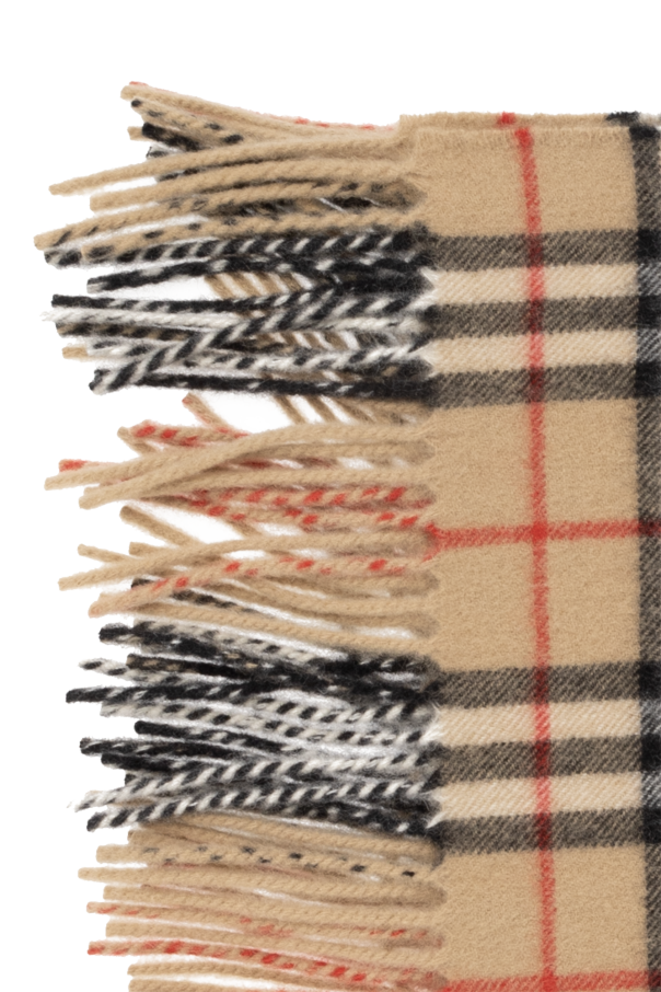 Beige, black and red scarf from Burberry. Made of cashmere, this item showcases the ‘Nova Check’ pattern and fringed edges.