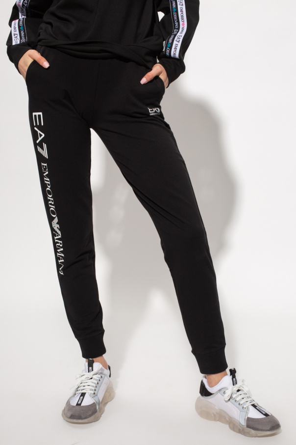 Black sweatpants from EA7 Emporio Armani. Crafted from cotton, this garment features an elastic waistband with drawstrings, white logo print, two slip pockets and ribbed cuffs.