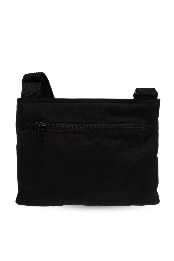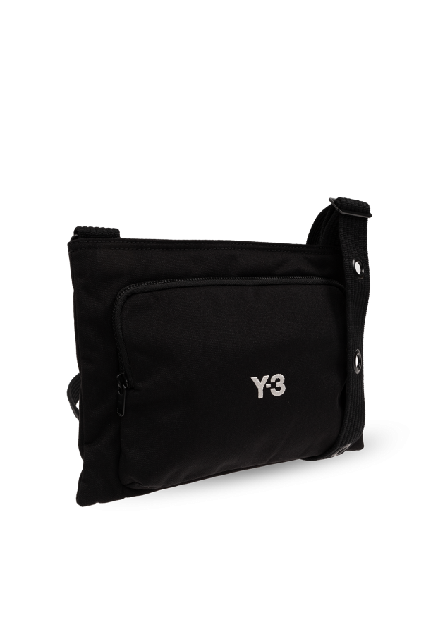 Black shoulder bag from Y-3 Yohji Yamamoto. Made from recycled material, this design showcases a printed white logo on the front, two external zip pockets on the front and back, black metal hardware as well as an adjustable strap and one internal compartment with a zip pocket.