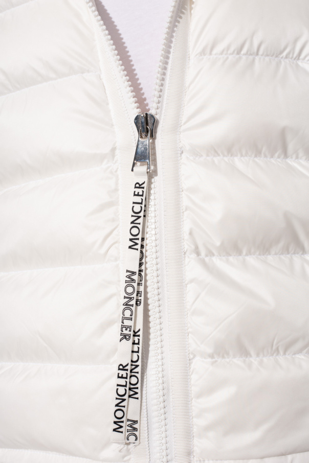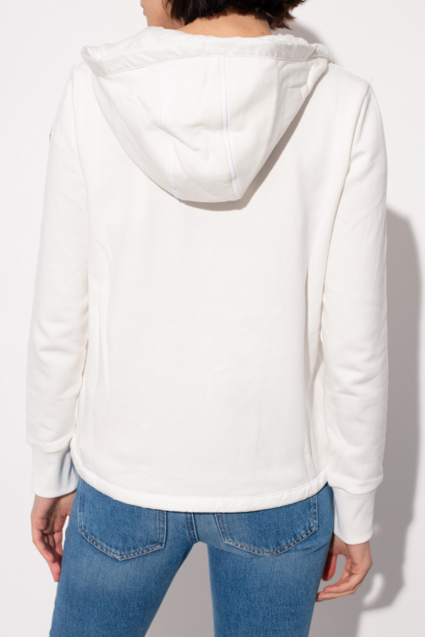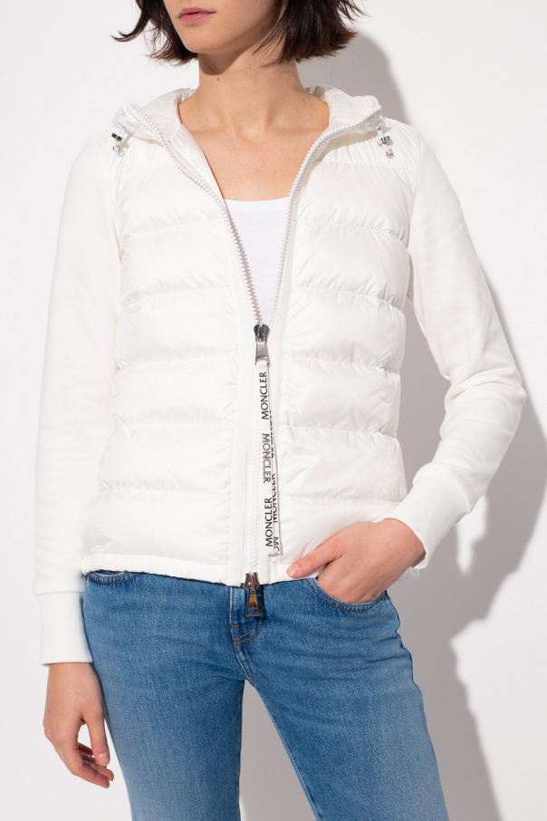 White hoodie from Moncler. Enriched by a quilted down front, this garment features a drawstring hood, two-way zip, sleeve patch with a logo, two pockets with concealed zips and ribbed trims at the hem and cuffs.
