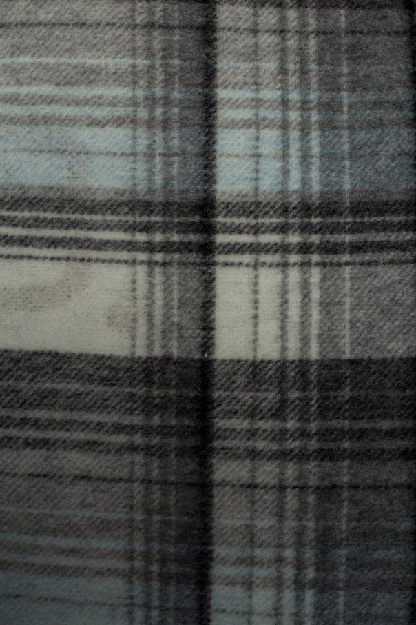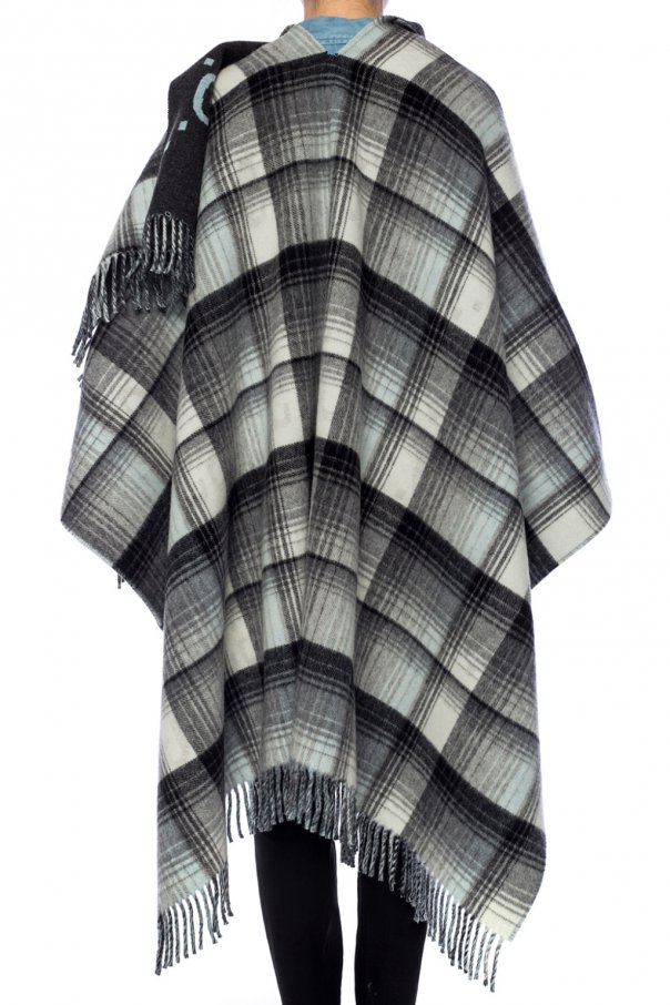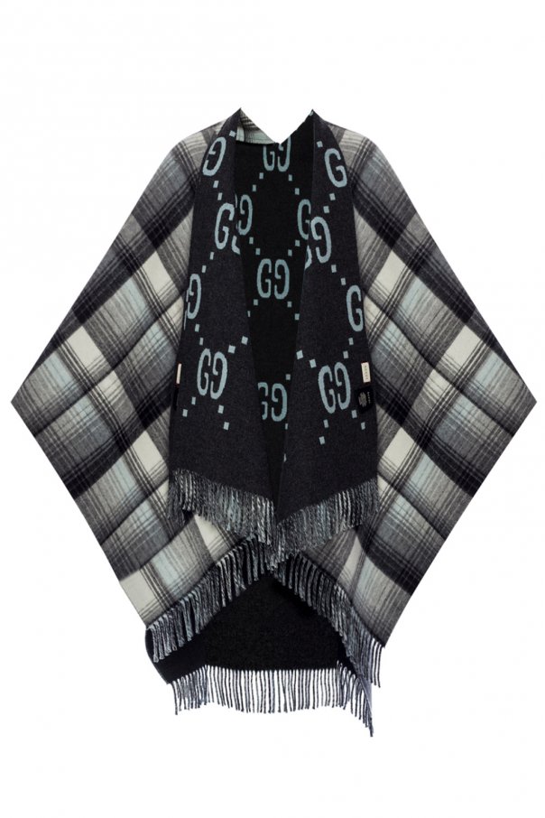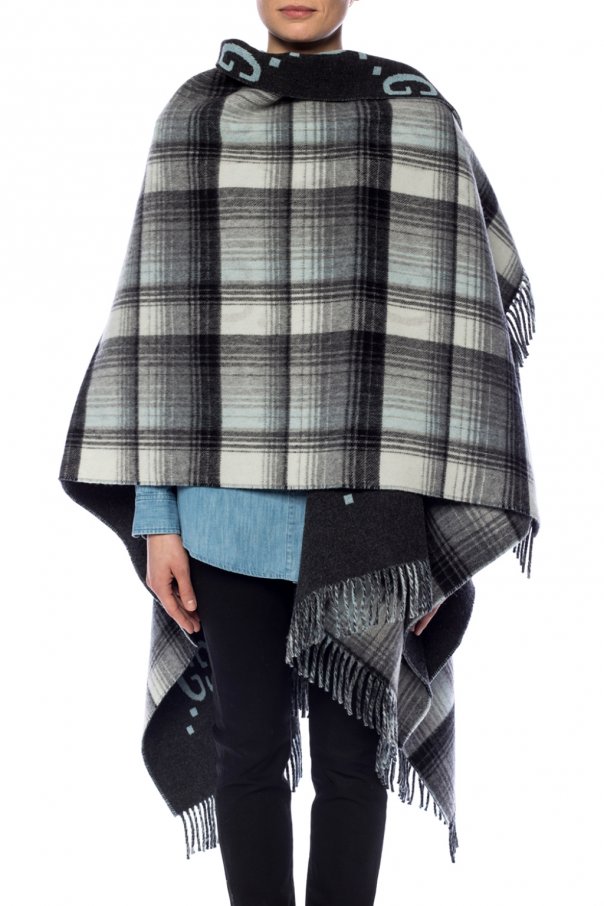 Grey reversible poncho from Gucci. Made of wool. One side decorated with an embroidered check pattern. Other side enriched by an embroidered logo pattern in light blue. Fringe ends.