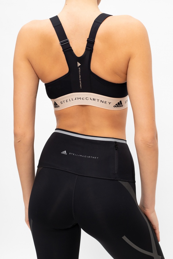 Black sports bra ADIDAS by Stella McCartney. Crafted from moisture-absorbing AEROREADY fabric, this style is complete with zip fastening on the front, a beige jacquard strap with logo and adjustable shoulder straps.