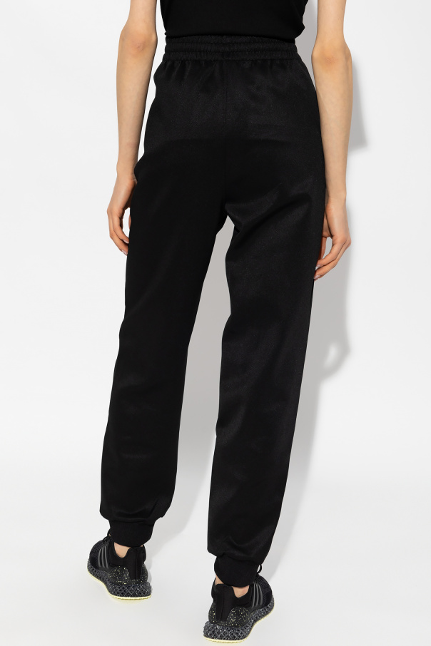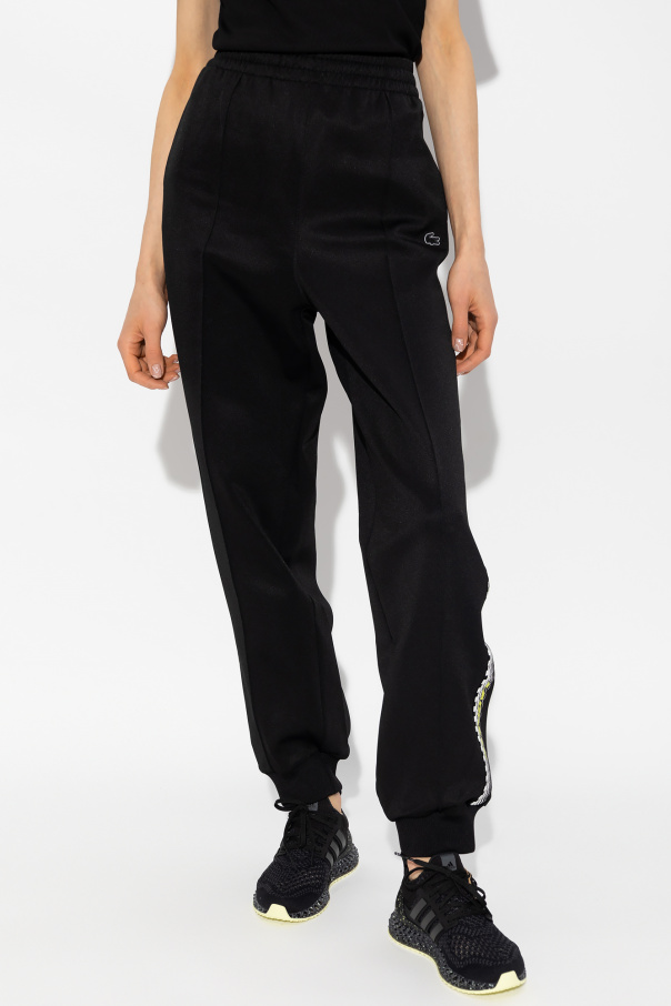 Black sweatpants from Lacoste. This pair features an elastic drawstring waistband, logo patch, white and black side stripes with light green logo, two slip pockets and ribbed cuffs.