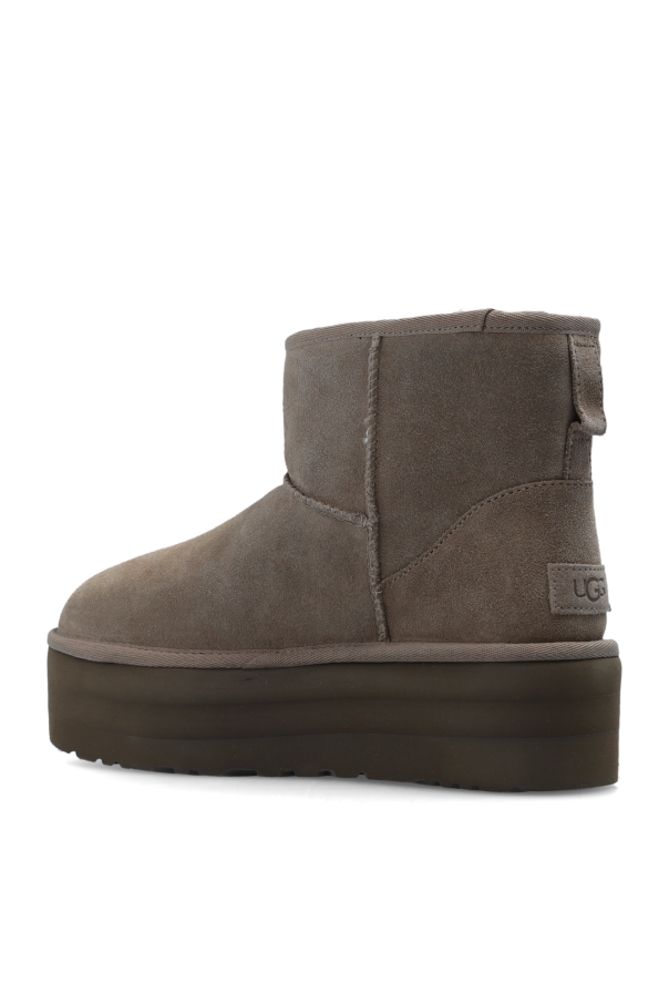 Grey ‘Classic Mini Platform’ snow boots from UGG. Made from suede and lined with UGGplush®, this model sits on a grey SugarSole™ outsole and features a logo patch on the back.