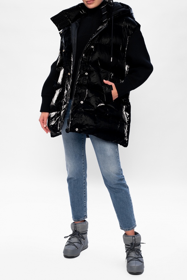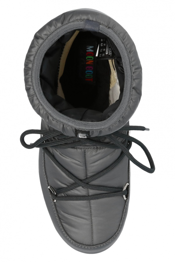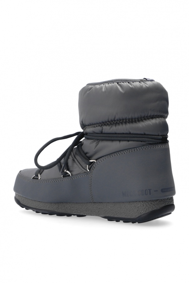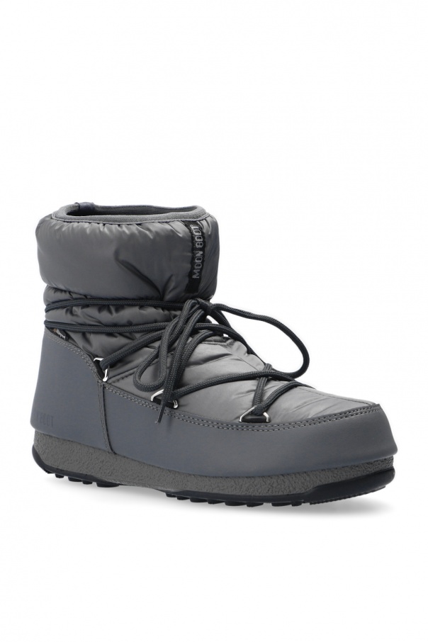 Grey ‘Low’ snow boots from Moon Boot. Crafted from eco-leather, this lace-up pair is set on a black and grey rubber sole and showcases textile panelling and logo of the label, which was printed and embroidered on the upper.